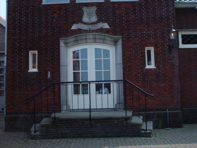 | Op de foto hiernaast is de in 1940 gerealiseerde nieuwe ingang met bordes te zien. Boven de ingang het wapen van Oterleek met het onderschrift RAD 1940. Achter deze entree was een hal met balie en de toegang naar de trap | ![]() |